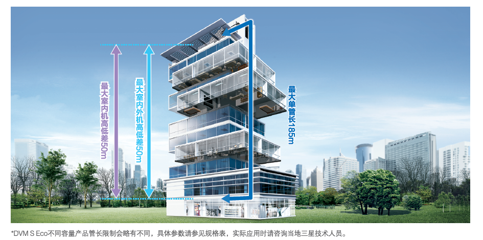 另外管长自由度高,最大单管长185m,最大室外机高低差50m,不受户型约束,用户无需顾虑室外机摆放问题,可根据实际需求随意设计自己的空间。