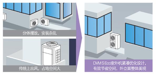 三星侧出风变频多联机采用紧凑的优化设计,有效释放机房空间,减小室外机体积(7-14HP),840mm超低宽度,可轻松置于飘窗下(4-6HP),用户可自由选择4个方向接管,并可将维修阀隐藏于机身外侧,保持楼体外观整洁。