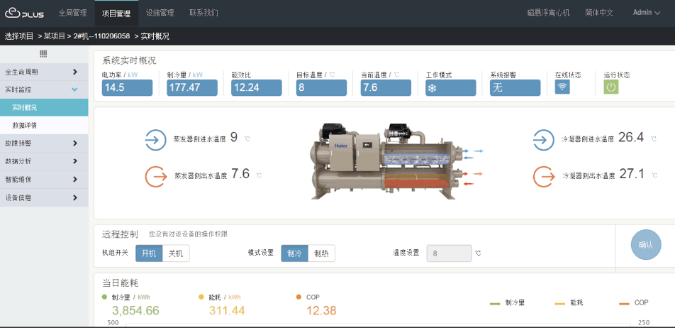 海尔磁悬浮中央空调运行数据与云端互相连接,及时准确上传平台,平台通过采集分析空调运行数据,为用户提供优化的节能策略与使用方式。