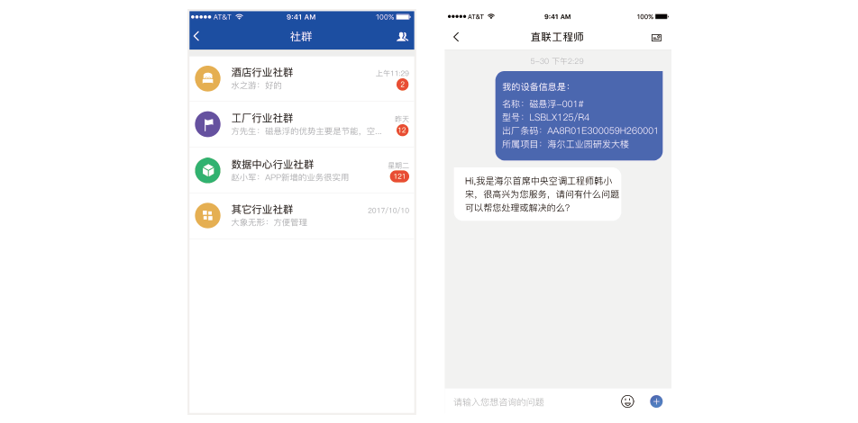 共享社群互动交流平台,用户可随时进行互联,海尔中央空调工程师实时在线,并及时掌握用户需求,在用户提出需求后,第一时间解决问题。