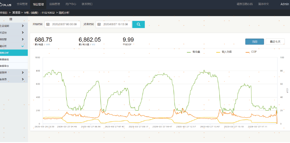 平台会显示当日及最近7天的累计电量、累计制冷量等,用户也可根据需求查询任意时间段内的能耗数据,生成曲线或到处下载,数据分析一目了然。
