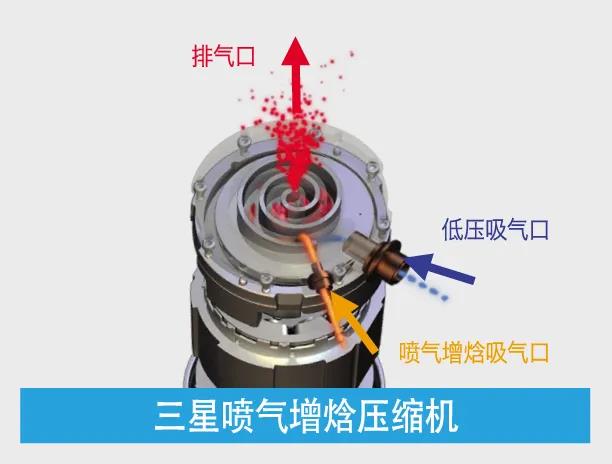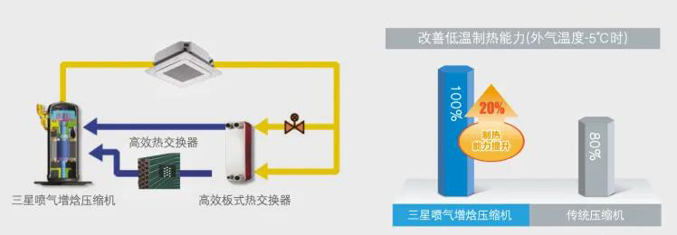三星全直流变频智能多联机,采用三星高压腔喷气增焓涡旋式直流变频压缩机,抽取部分中间压力冷媒,通过中压吸气口,向压缩腔直接补充冷媒气体,增加压缩机排气量,使系统在严寒气候条件下仍然强劲制热,在制冷时亦可增加冷媒量,并自动调节压缩机频率,有效提高部分低负荷与满负荷下系统效率。