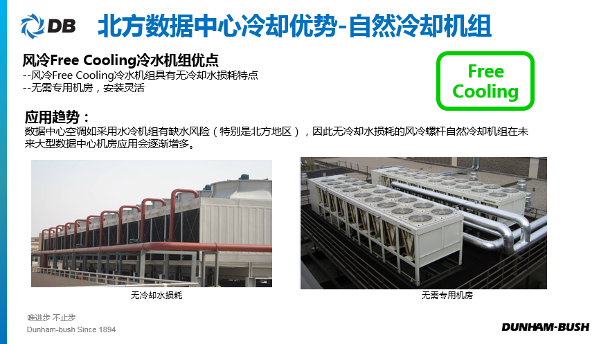 离心机与自然冷却机组均是顿汉布什的优势产品,尤其是自然冷却机组,已经服役多个数据中心项目,采用环保冷媒,在夏季、过渡季节及冬季,直接从外界低温空气中获取冷量,获取低温水。压缩机根据负荷变化自动调节,部分负荷运行或完全停止运行,年运行时间减少1/3,节约能耗最高可达40%以上,在保证数据中心保持良好制冷效果的同时,大大降低了机组的运行费用,为客户带来更高经济效益。