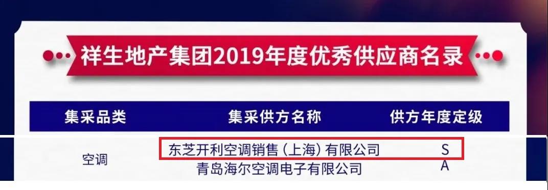 4月20日,祥生集团发布了“2019年度优秀供应商名录”,参评集团集采供应商共计101家,涵盖电梯、空调、进户门、洁具等品类;其中S级供方10家,A级供方11家,B级供方42家。东芝空调入选为2019年度祥生地产集团空调类S级优秀供应商。