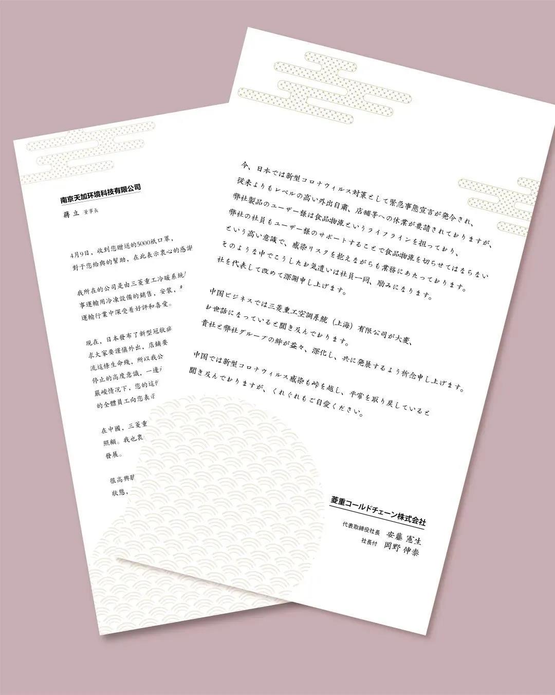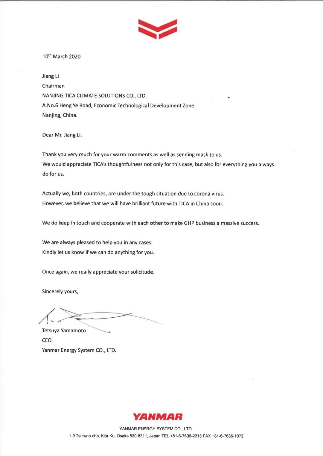 日本洋马向天加发来感谢信表示,非常感谢天加在中日两国疫情都很严峻的时候,依然倾囊捐赠珍贵的口罩,也希望疫情早日结束,洋马也会坚持持续和天加直保持紧密合作,共同推动GHP业务发展。