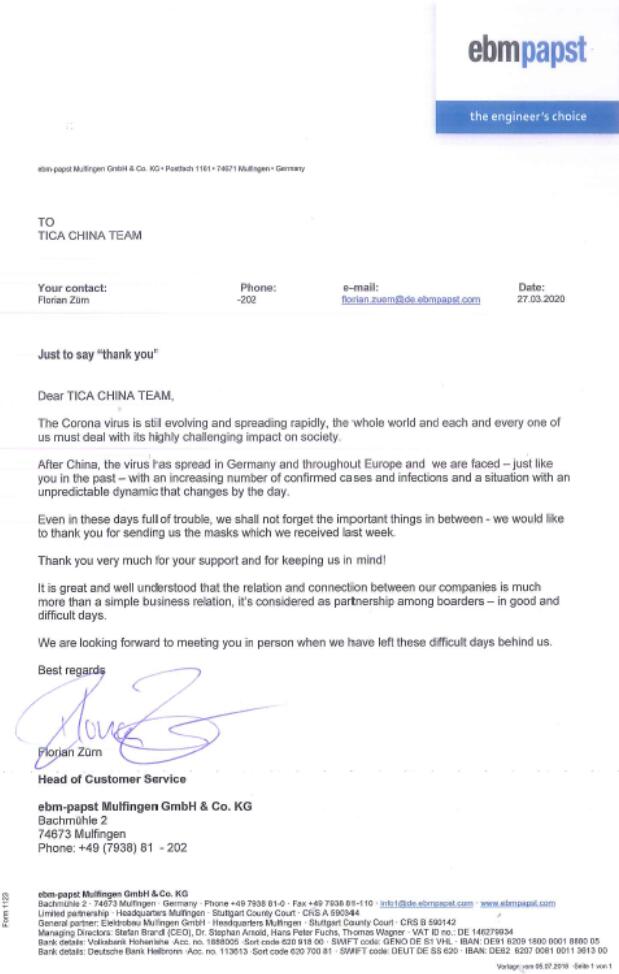 德国EMB非常感谢天加赠送的口罩,感谢天加一直以来的牵挂和支持。EBM和天加,不单单是普通的生意关系,更是战略合作伙伴的关系,非常感激大家能够一起共克时艰。