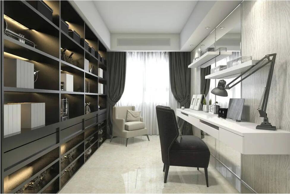 书房不一定是单独的房间,一块独立的区域同样让人有归属感,比如在客厅靠近阳台的地方开辟一个空间,光线充足,视野开阔,是家里没有多余房间的家庭的理想选择。