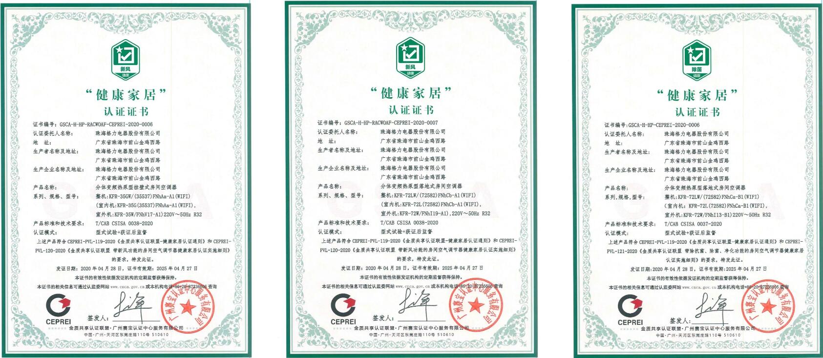 近日,格力新风空调挂机KFR-35GW/(35537)FNhAa—A1(WIFI)、柜机KFR-72LW/(72582)FNhCb—A1(WIFI)、柜机KFR-72LW/(72582)FNhCa—B1(WIFI)荣获行业首批“健康家居”认证证书,其中第三款为新国标产品。