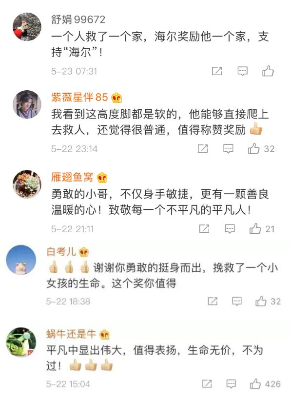 5月22日,海尔官方微博发布消息:为弘扬其见义勇为精神、传递正能量,海尔智家决定对胡云川做出嘉奖: