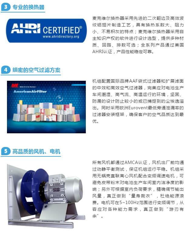 凭借着对高品质坚持不懈的追求,麦克维尔在新能源领域不断推陈出新,以创新的产品、个性化的解决方案,获得了大量新能源行业客户的认可,持续为北电爱思特(江苏)、兰州金通储能动力新材料有限公司100kt/a三元项目、万向A一二三/万向精工、三星环新(西安)动力电池、中航锂电(洛阳)产业园、佛山科力远混合动力、迪皮埃风电叶片(扬州)有限公司、协鑫新能源、村田新能源等项目提供了空气处理机组方案。