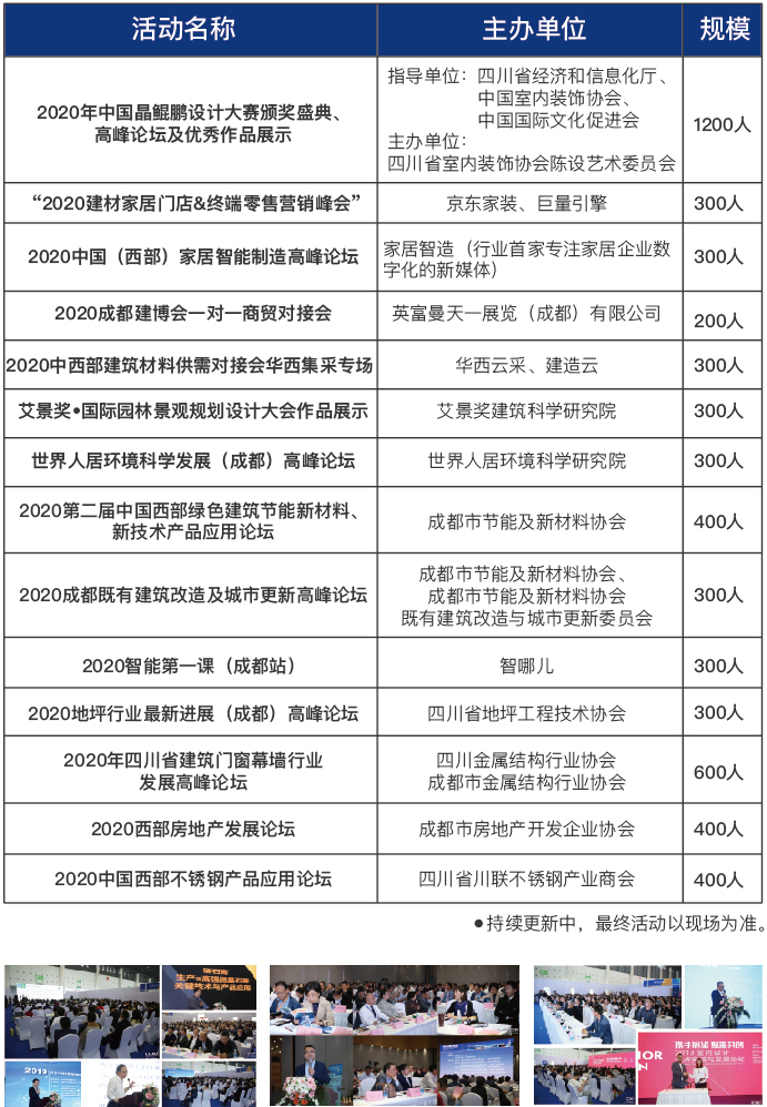 2020年成都建博会将秉承全产业链展出的聚合优势,不断完善“大家居、智能舒适家居、节能建筑新材料及装配式建筑“三大主题展,为行业的企业拓展中西部市场提供展示新产品、新设计、新技术、新材料和新战略的优质平台,助力行业展现疫后新机遇、新市场。