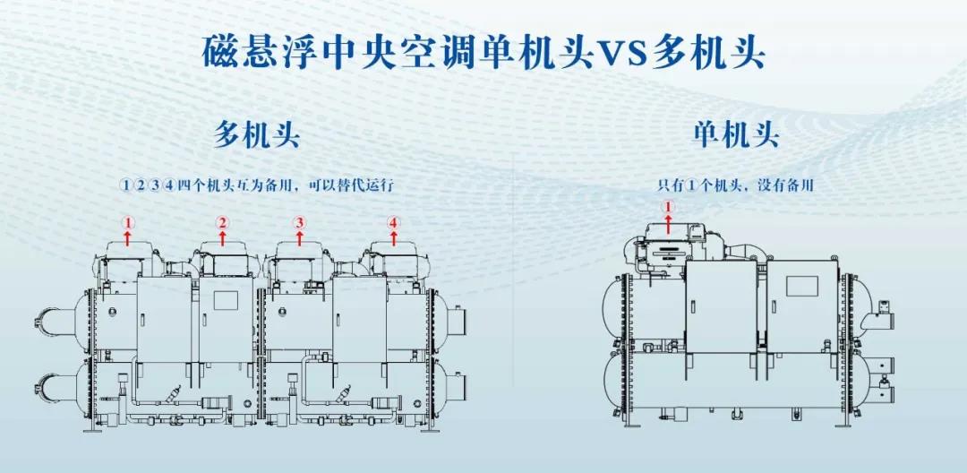 海尔磁悬浮中央空调多机头机比单机头在低负荷区具有更高的效率,最为重要的是,多机头之间互为备份,当单个机头故障停机或检测维修时,其他未运转机头开始运行,可实现不停机维护,给足项目方安全感。