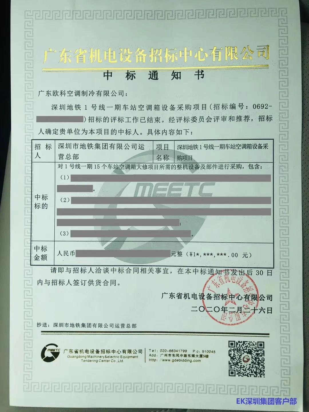 EK自服务于成都地铁、青岛地铁、长春地铁、杭州地铁等多个轨道交通项目之后,再次迎来喜讯,凭借出色的技术解决方案和完善优异的售后服务,EK深圳办集团客户部成功中标深圳地铁1号线一期车站空调箱设备采购项目,中标金额超千万元,主要提供EKDM系列组合式空气处理机组等中央空调设备。
