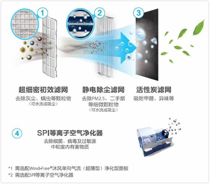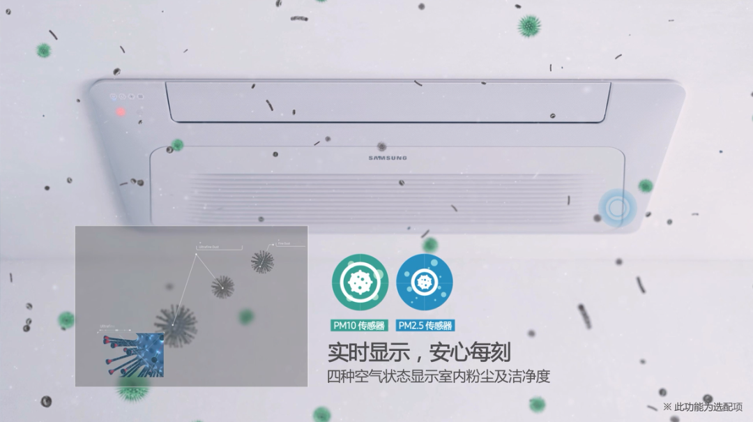 三星中央空调,自带PM2.5/PM10浓度传感检测器,实时显示屋内空气质量,提醒你是否该通风换气,不方便开窗的日子里,通过超细密初效滤网、静电除尘滤网、活性炭滤网重重过滤去除异味、粉尘,再配合三星SPI(S-Plasmaionizer)等离子空气净化装置,加强净化效果,让您和家人呼吸绿色空气!