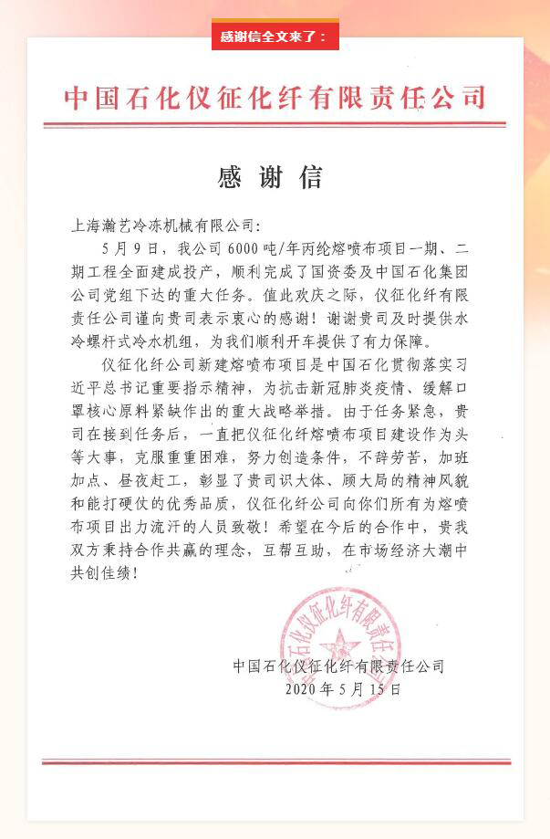 对此,中国石化仪征化纤有限责任有限公司对瀚艺空调发出感谢信,对瀚艺空调在新冠疫情期间做出的重要贡献,给予了高度评价: