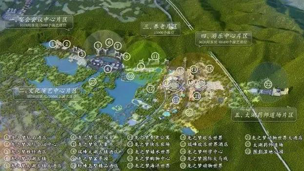 项目分为五个片区,分别是宴会会议中心片区、文化演艺中心片区、游乐中心片区、养老片区以及药师文化园,合计拥有约28000间酒店客房、75000个演艺席位、20000个停车位、20万平方米宴会会议厅,是综合性文化旅游休闲度假区。