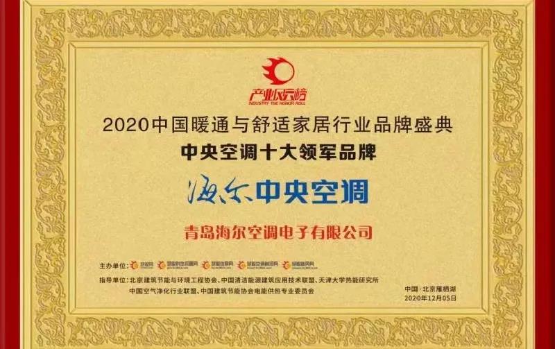 海尔:彰显品牌力量!再被授予“中央空调十大领军品牌”!