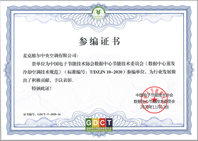 11月,麦克维尔正式作为《数据中心蒸发冷却空调技术规范》(标准编号:T/DZJN 10-2020)的参编单位,荣获中国电子节能技术协会、数据中心节能技术委员会颁发的表彰证书。
