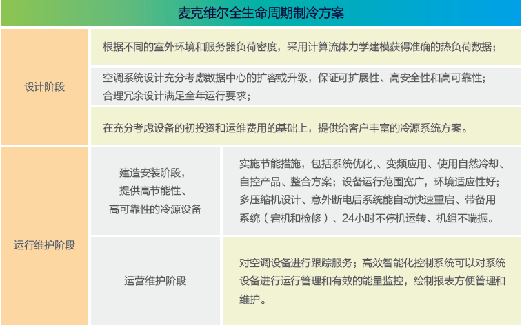 历经百年发展,在数据中心领域,麦克维尔拥有变频技术、双级压缩技术、自然冷却技术、磁悬浮技术、快速启动技术、智能控制等6大核心优势、完善的数据中心产品系列以及全生命周期制冷方案。