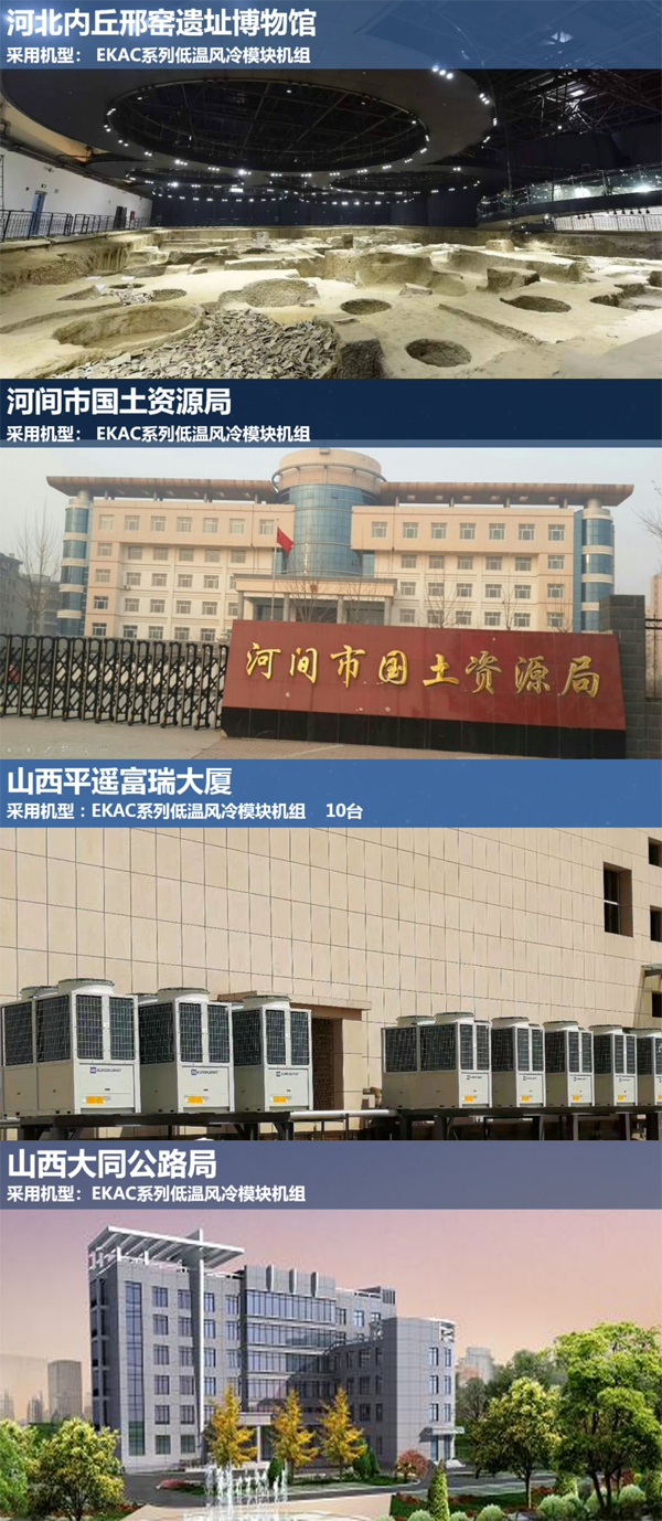采用设备:EKAC系列低温风冷模块机组30台、EKAH系列超低温空气源热泵机组32台