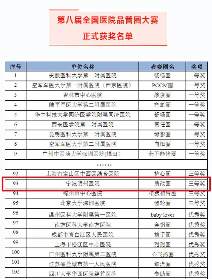 12月10日,第八届全国医院品管圈大赛获奖名单正式公布,宁波明州医院主题为《构建数字化医院模式下的归档病历质量和存储管理》的参赛项目,喜获【三级医院综合专场-三等奖】!