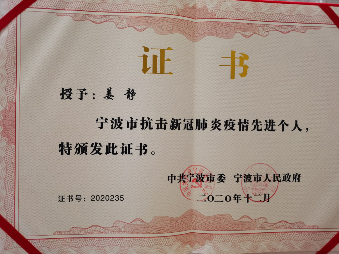 第二批援鄂医务人员领队姜静获得【先进个人】称号。