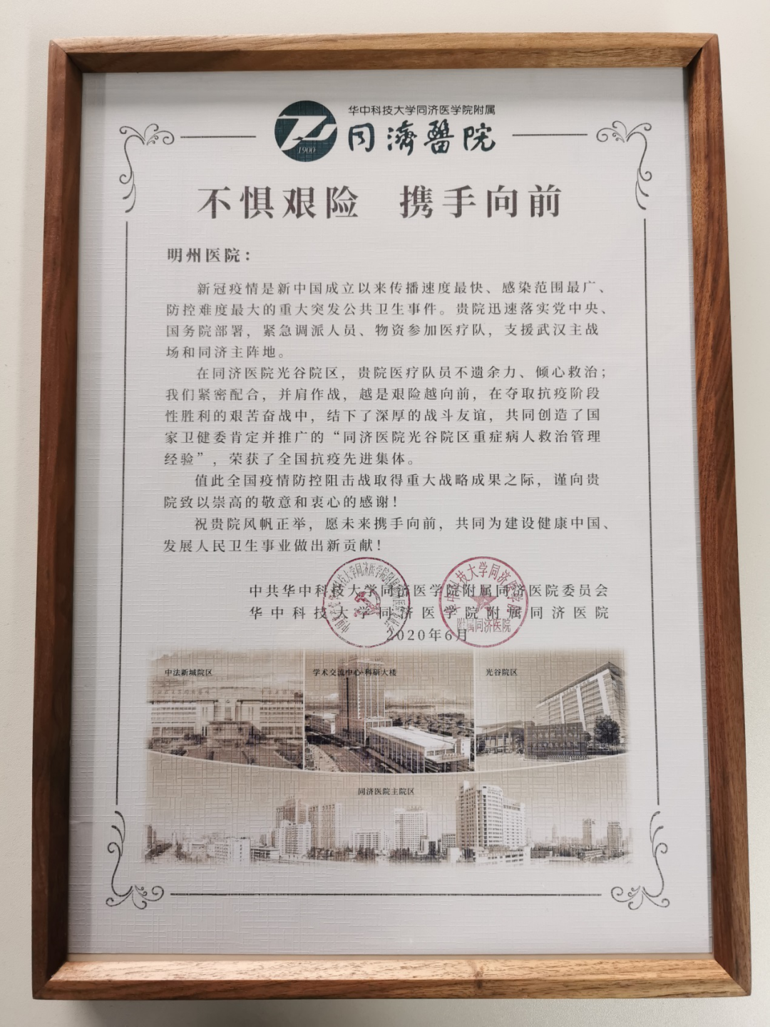 今天,医院还收到了在武汉援助时期定点的华中科技大学医学院附属同济医院的感谢信,感恩宁波明州医院在特殊时期的“不惧艰险,携手向前”。