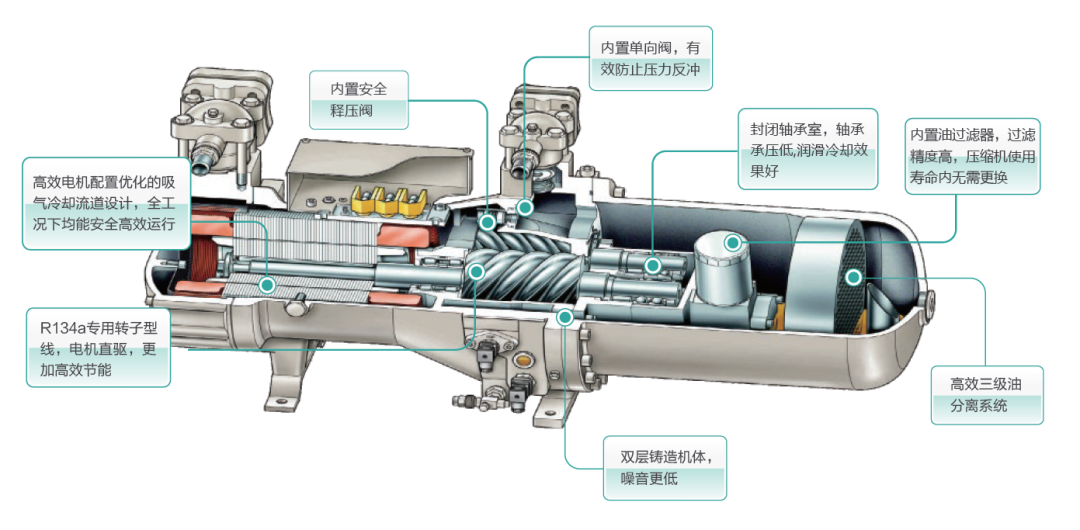 此次推出的Hi-SC S系列最大的亮点来源于采用了成熟的双螺杆压缩技术,压缩机运转部件少,从而更加高效稳定,可靠性增加。采用三级回油管理技术,在确保压缩机有足够的油供应、满足压缩机转子及轴承良好的润滑和冷却密封的同时,避免过多的油进入系统导致换热器换热效率降低,确保系统稳定高效的运行。高效电机直驱,优化冷媒冷却流道,提高电机效率,全工况下均能安全高效运行。全新高效满液式蒸发器,全面提高换热效,独特的均液板设计和优化的换热管排布,保障制冷剂分配均匀,换热充分。