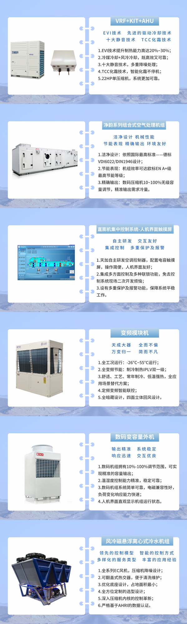 此次天加以细分市场制药行业的厂房净化系统解决方案为主,携风冷磁悬浮机组和数码直膨净化机组等产品亮相展会,全面展示了制药行业所需的高效、节能、净化、恒温恒湿等解决方案。同时针对海外市场的需求,天加还展出了变频模块机和TIMS Hyplus洁净多联机的组合方案。