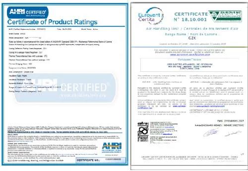 该产品漏风率、箱体强度均要达到欧标最高1级水平。机械性能参数取得Eurovent及AHRI双认证,所有认证均为一级水平。充分保证平疫结合医院对设备稳定性的要求!