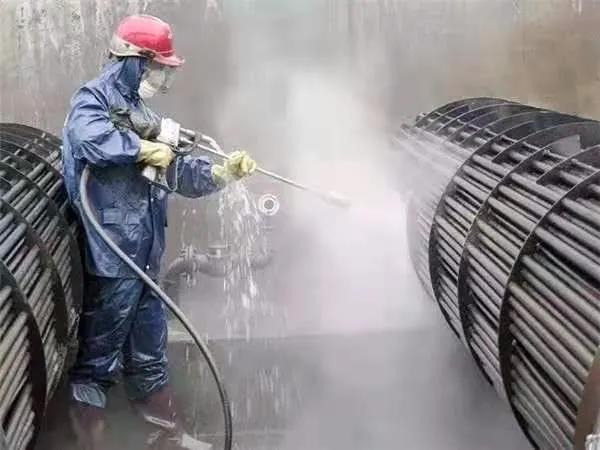 因为大部分冷却水系统是开式循环系统,冷却水与空气长期接触,空气中CO2、SO2、NO2、O2等气体便会溶解于冷却水中并呈现酸性及强氧化性(如冷却水泵的叶轮出现气蚀现象),久而久之,冷却水管、填料表面、集水盘形成一种含有嗜肺军团菌、b-溶血性链球菌、藻类、O2+的等致病微生物附着物,严重的腐蚀水管、污染环境(冷却塔附近下酸雨)。因此清洗时采用弱酸性清洗剂,采用5%的弱酸性除垢剂、缓蚀剂、镀膜水溶液清洗三遍,清洗程序同上。
