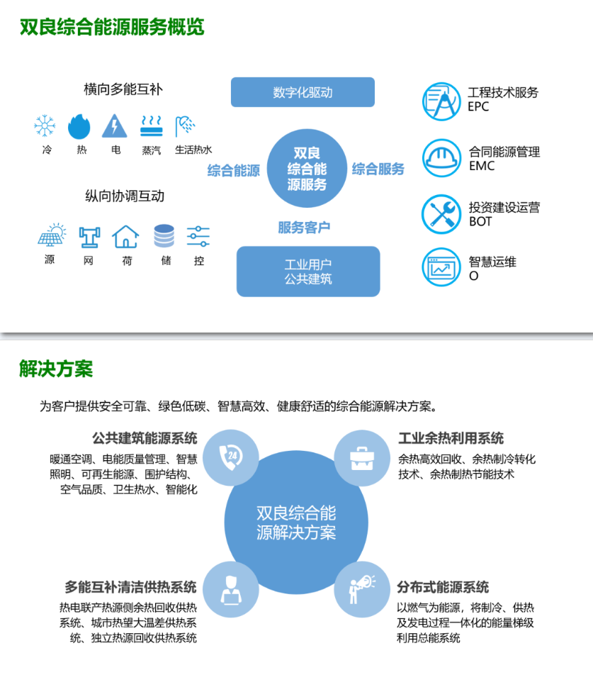 双良综合能源服务可实现横向冷热电蒸汽热水多能互补,纵向源网荷储控协调互动;综合服务包含工程技术服务(EPC)、合同能源管理(EMC)、投资建设运营(BOT)、智慧运维(O)。目前已形成研发、技术、金融、业务四大生态。解决方案包含4大系统:公共建筑能源系统、工业余热利用系统、多能互补清洁供热系统以及分布式能源系统。为公共建筑和工业用户提供安全、绿色、高效、智慧的全方位能源系统。