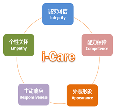 秉承i-Care服务理念,即“诚实可信(Integrity)、能力保障(Competence) 、外表形象(Appearance)、主动响应(Responsiveness)、个性关怀(Empathy)” 五维模型服务于客户,致力成为最可依赖的专业顾问和合作伙伴。