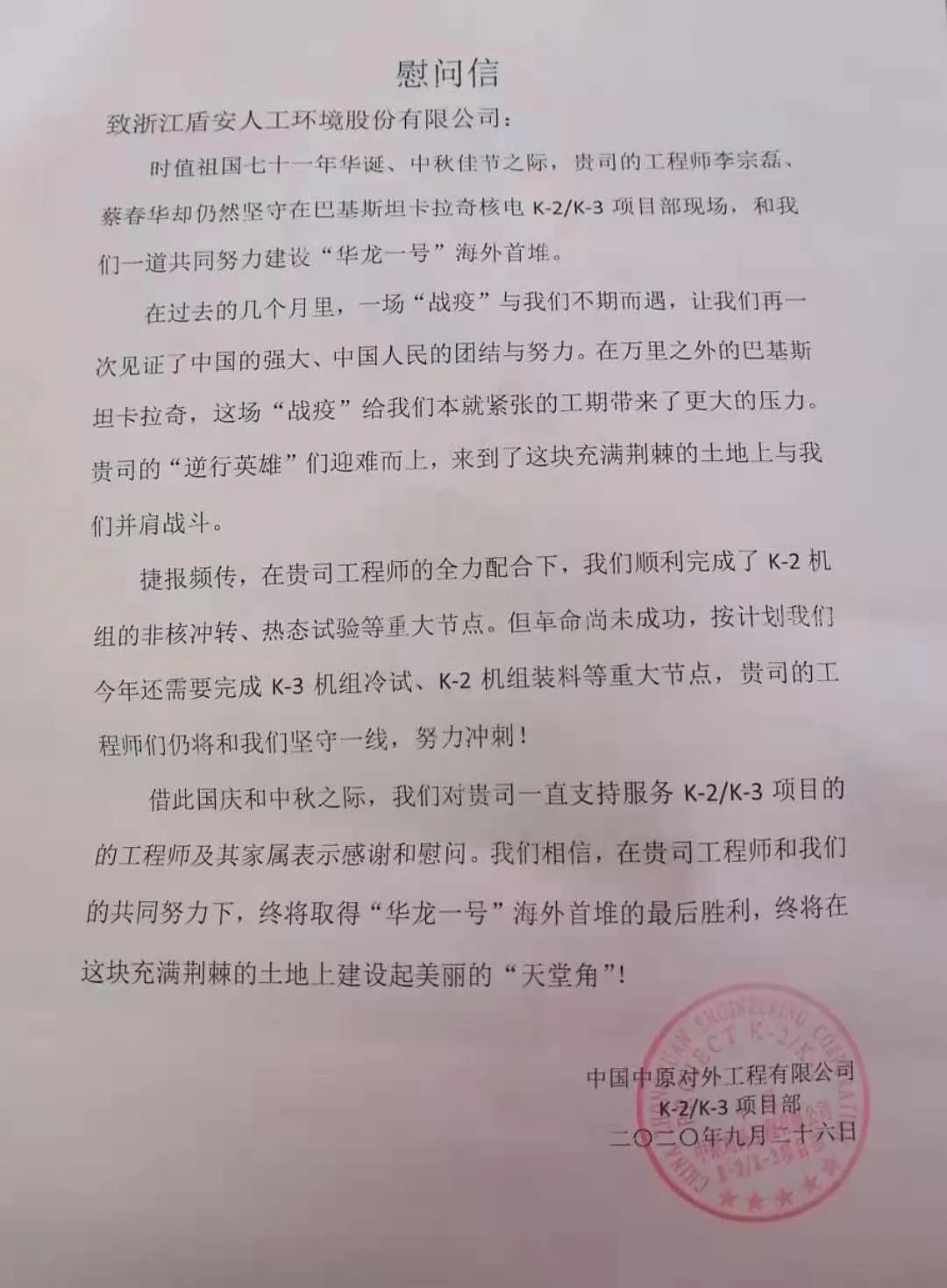 项目目前正在建设中,但是中国中原对外工程有限公司第一时间写信表扬我司现场服务工程师,并感谢我司售后服务团队对K2K3建设工作的大力支持!