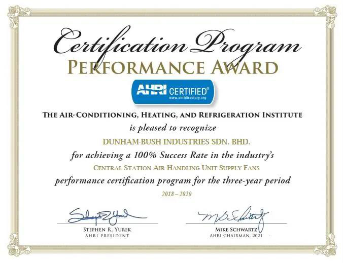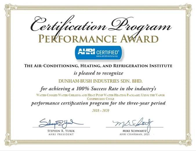 近日,顿汉布什获得美国空调供热制冷协会AHRI的认可,获得“PERFORMANCE AWARD”(蝉联三届),表彰顿汉布什过去三年在AHRI测试中全部测试一次性通过的优异表现。
