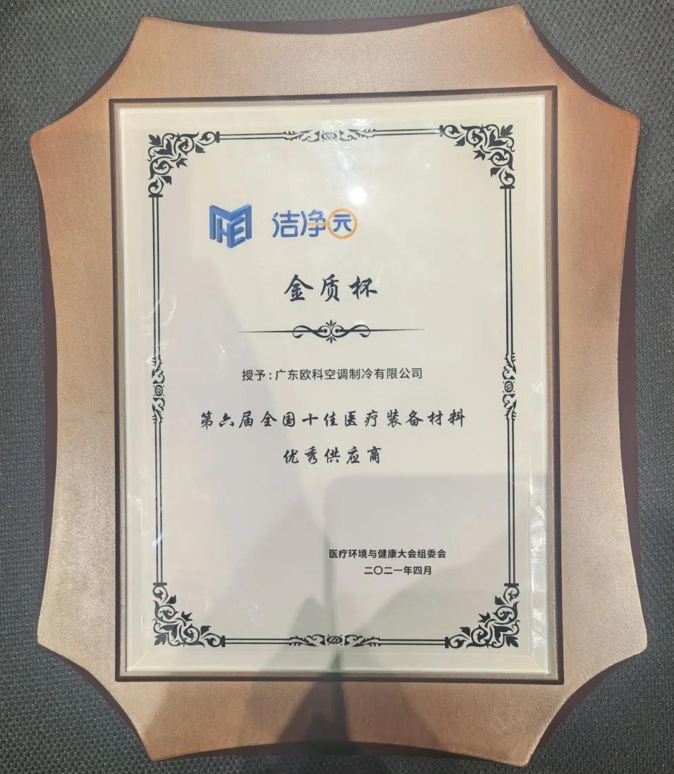 大会同期举办多场分论坛及会议平行活动,在第六届“金质杯”评选活动颁奖典礼上,广东欧科空调制冷有限公司凭借抗疫期间的突出表现及专业全面的医疗净化领域解决方案喜获“第六届全国十佳医疗装备材料优秀供应商”。