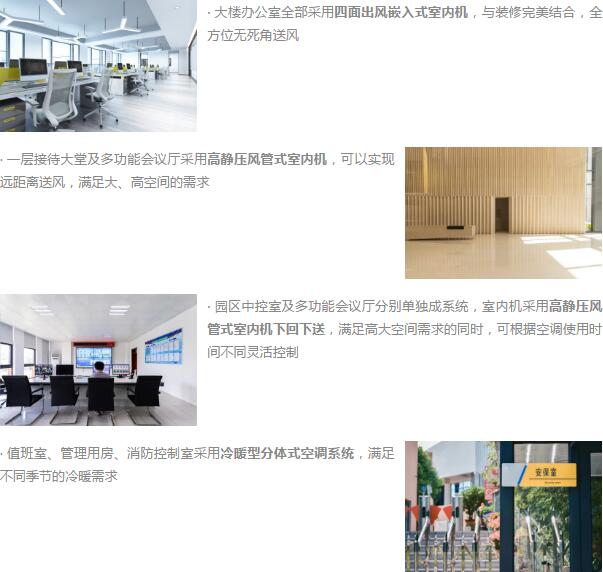 该方案完美解决了综合服务办公大楼冬季制热、夏季制冷及过度季节制热需求,同时产品的高能效也大大降低了园区暖通系统运行成本。