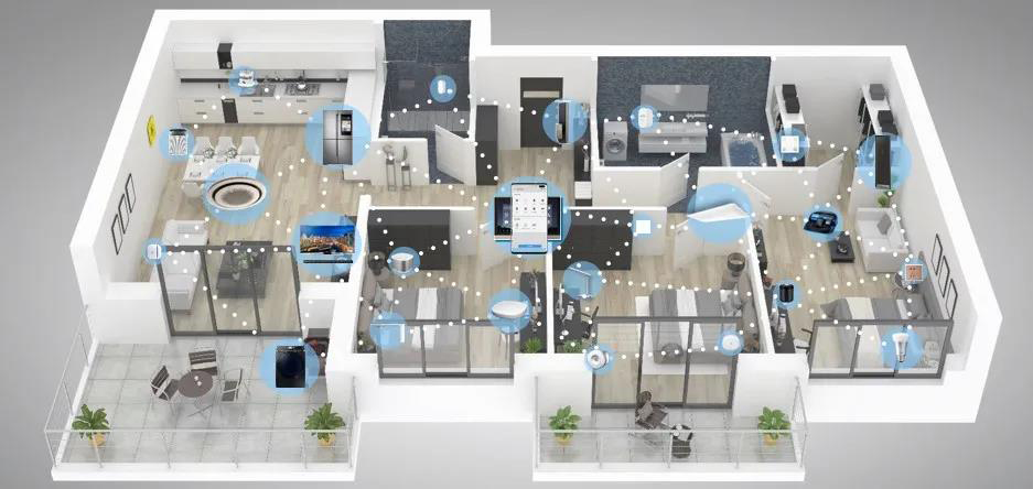 三星智家系统具有5大应用场景解决方案,包括智能空气环境系统、 智能安防门禁系统、 智能房间(客/餐/厨卫/书/卧)场景体验、 智能家电(智能灯光、窗帘、家电控制系统)体验、 智能生活情景模式体验。