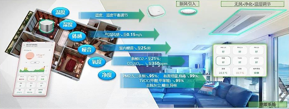 优化调节室内温、湿、氧度、洁净度及风感、噪音,为家创造舒适健康的室内环境。