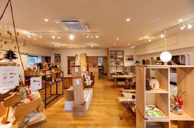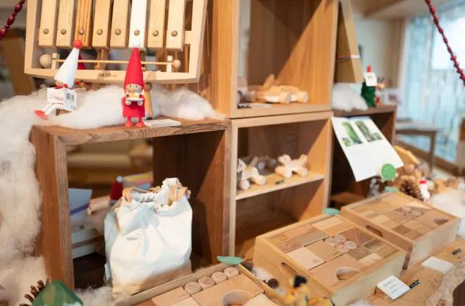透过玻璃窗看进去,在这个能够感受到木头温度的空间里,排列着有品位的家具和可爱的木制玩具,木制住宅的构造也有展示。