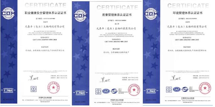 近日,元泰丰(包头)生物科技有限公司(简称元泰丰)顺利通过ISO“三体系”(ISO 9001:2015质量管理体系、ISO 14001:2015环境管理体系和ISO 45001:2018职业健康安全管理体系)认证,这是元泰丰管理迈向规范化、标准化、科学化,与国际标准接轨的重要一步,标志着公司管理水平迈上新台阶。
