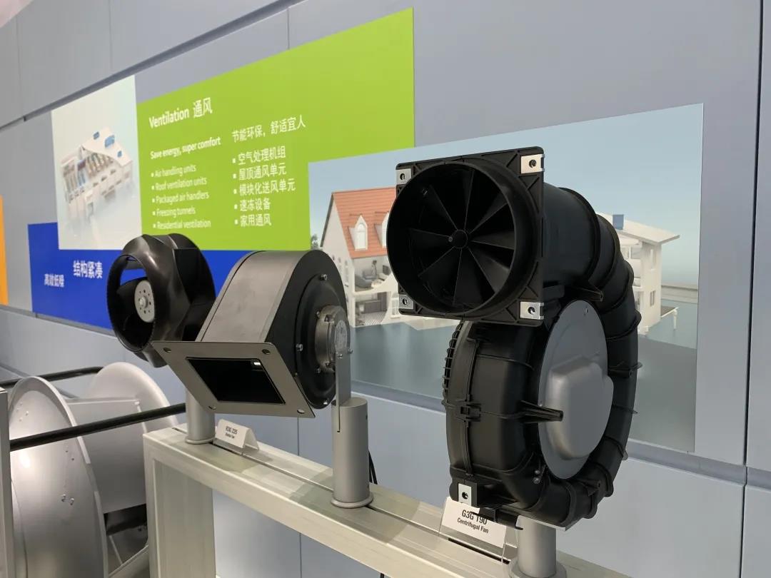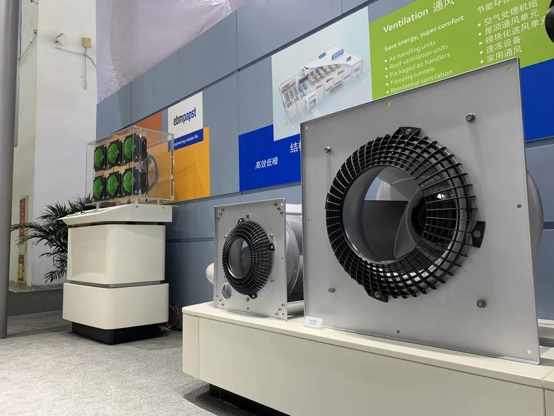 在商用通风领域,即插即用型RadiPac离心风机设计非常紧凑,通过MODBUS可实现远程监控,实现基于需求的高效运行,这些优势使其成为空气处理机组(AHU)的理想之选。此外,现场演示的FanGrid风墙Demo,为客户可视化模拟了风机的运行状态。