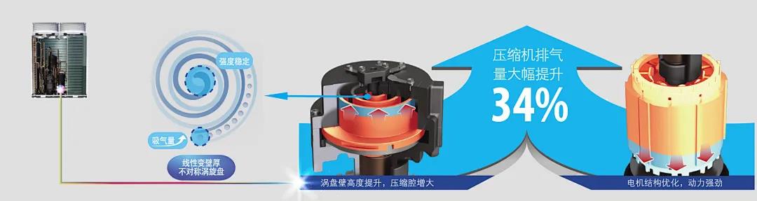 团强大而专业的科技研发优势自主研发空调压缩机——高压腔气液增焓涡旋式变频直流压缩机采用线性变壁厚涡旋盘设计,外侧壁厚减少增加吸气量,从而大幅提升排气量;内侧壁厚增加,机械强度增加,具有更好的可靠性。