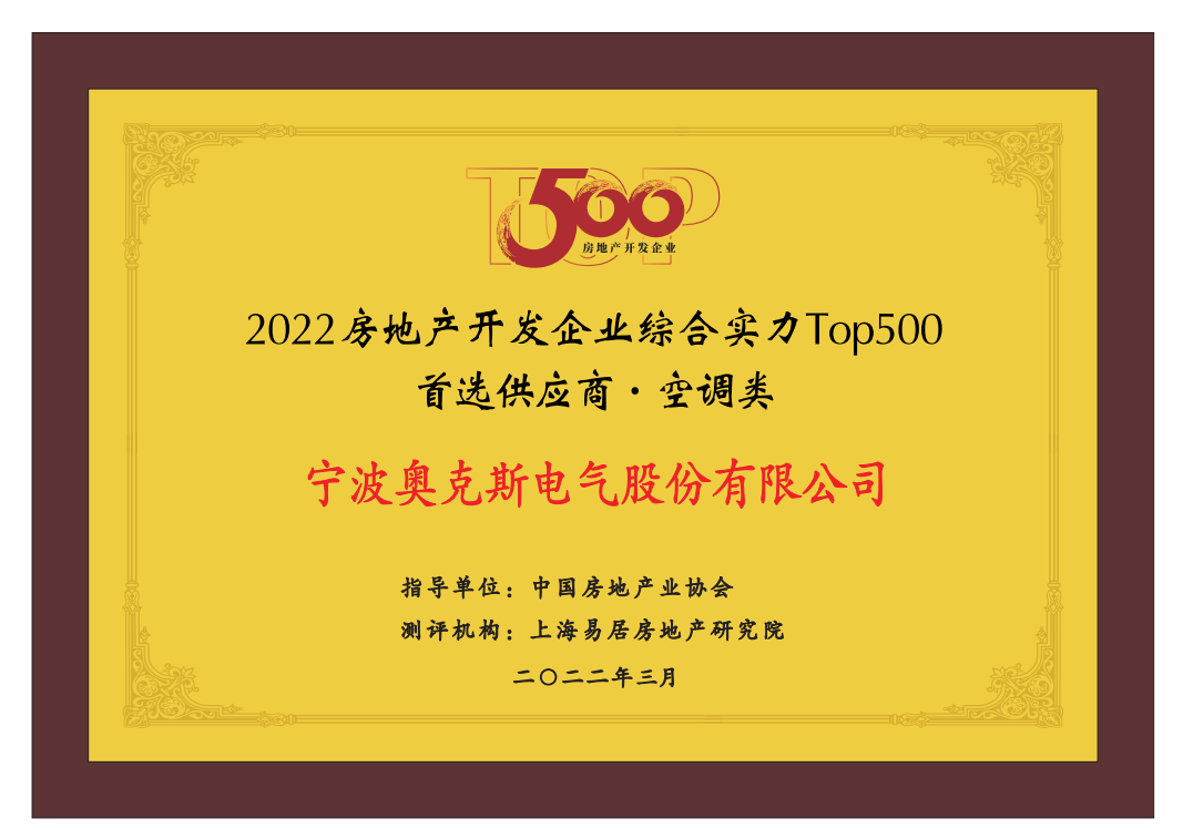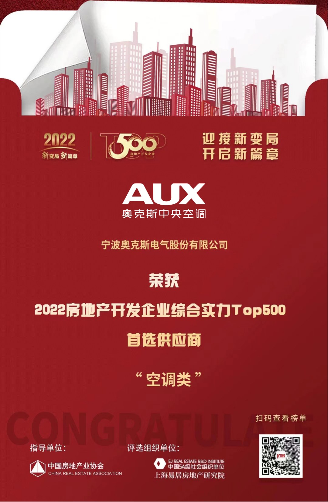 荣登前10强!奥克斯中央空调入选“2022房地产开发企业综合实力TOP500首选供应商”