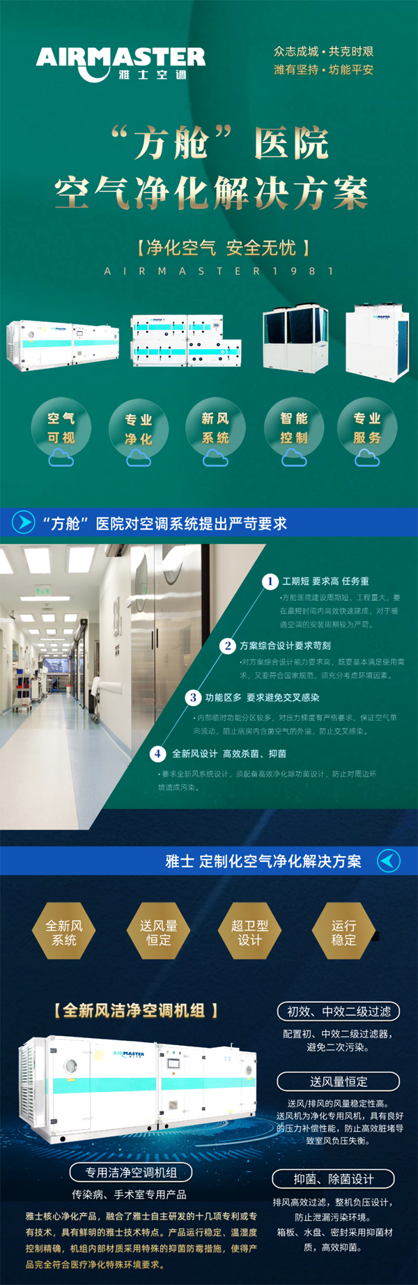 雅士方舱医院专用净化方案,定制化设计、高效抑菌除菌,为方舱医院内医患人员提供更加洁净、安全、健康、舒适的空气环境。