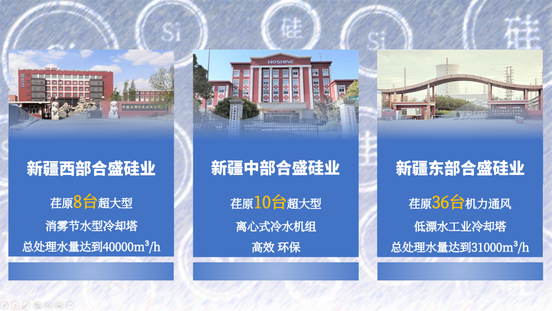 品牌选择品牌,高端认可高端,合盛硅业至今已经在新疆西部合盛硅业、新疆中部合盛硅业、新疆东部合盛硅业三大基地选择荏原的高端产品,产品涵盖高效离心机、大型消雾节水型冷却塔和低漂水工业冷却塔。荏原将用稳定的产品和先进的技术,助推合盛硅业扩大在硅基新材料全产业链的布局,为合盛光伏新能源业务快速发展护航。