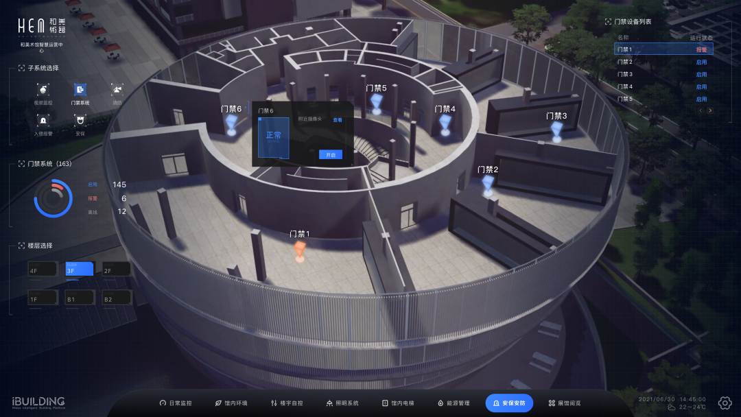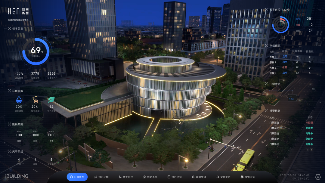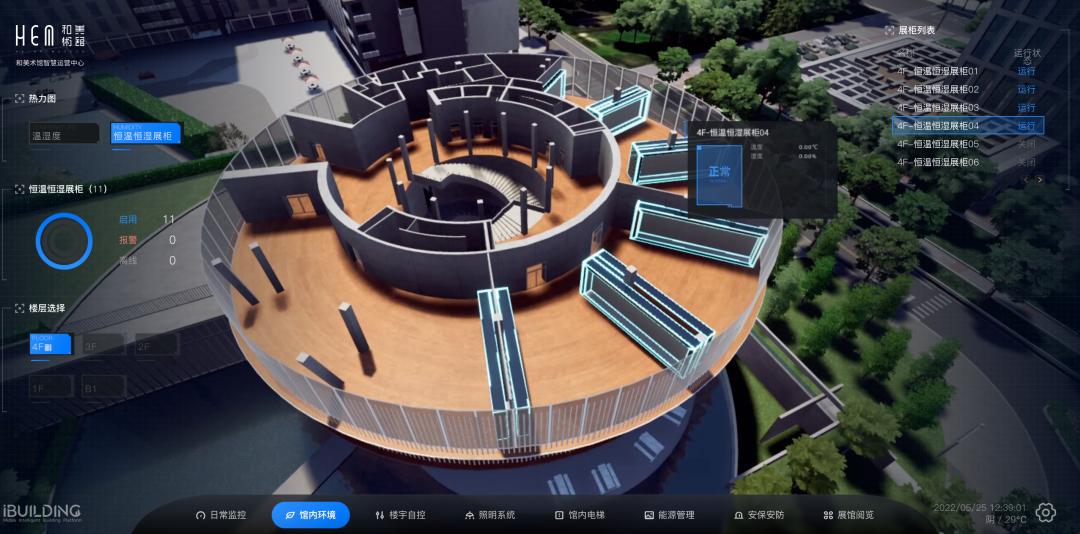 iBUILDING数字化平台依托数字孪生构建的智慧运营中心,以全局运营视角,助力和美术馆的数字化管理建设。通过日常监控界面即可了解和美术馆整体运营状态,将馆内环境、楼宇自控、照明系统、馆内电梯、能源管理、安保安防、展馆阅览进行集成展示,从设备到空间,对环境管理、安全管理、运维情况进行全面提升,助力和美术馆数字管理建设。