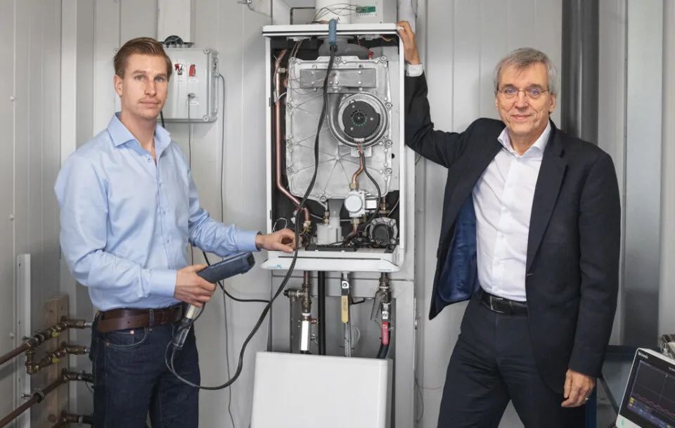 对于Intergas项目经理Gerrit Zijlstra(左)和首席技术官Peter Cool来说,氢气锅炉是能源转型的一个里程碑