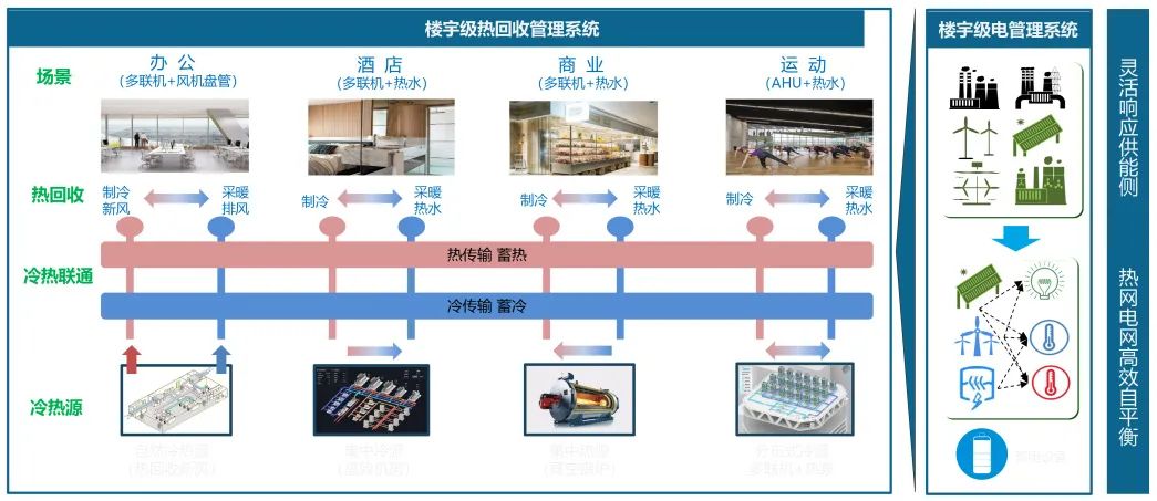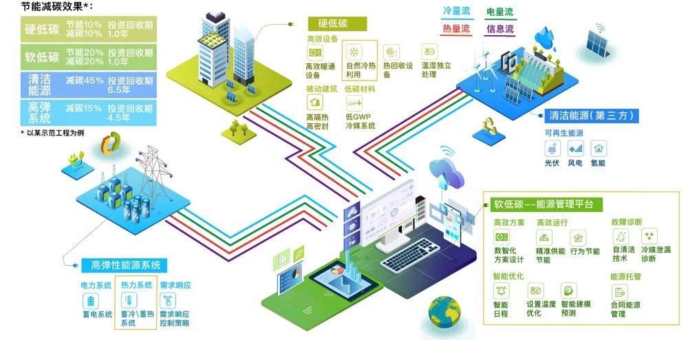 通过数字化识别办公、商业、运动、酒店等各功能区域负荷,以热回收+储冷储热为核心打造建筑节能+柔性的碳中和解决方案。采用楼宇级热电综合能源设计与管理,实现灵活响应供能侧+热网电网高效自平衡,降低运行碳排放30%~50%。