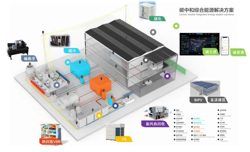 美的楼宇科技为美的工业园西区提供了低碳智能的综合解决方案,通过设备提效(高效多联机、电梯能量反馈)、系统提效(楼宇自控、智能照明、智慧运营)、能源结构优化(太阳能光伏发电、高效储能)、碳汇交易(实践碳汇交易、购买绿色权益)、智慧办公(灵动办公、无界会议、智慧通行),将其打造成全数字化场景体验、高效运维、低碳示范展示以及可持续进化的数字建筑生命体。